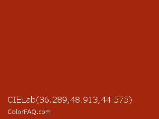 CIELab 36.289,48.913,44.575 Color is a normal red color and the nearest color is Tabasco #a02712. Hex code #a2270c and RGB value is rgb(162,39,12). In RGB color space, this color is composed of 64% red, 15% green, 5% blue, In CMYK color space, this color is composed of 0% cyan, 76% magenta, 93% yellow , 36% black , In HSL color space, this color has a hue angle of 11° , 86% saturation and 34% lightness.
