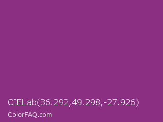 CIELab 36.292,49.298,-27.926 Color is a normal magenta color and the nearest color is Razzmic Berry Crayola #843179. Hex code #8b2f83 and RGB value is rgb(139,47,131). In RGB color space, this color is composed of 55% red, 18% green, 51% blue, In CMYK color space, this color is composed of 0% cyan, 66% magenta, 6% yellow , 45% black , In HSL color space, this color has a hue angle of 305° , 49% saturation and 36% lightness.