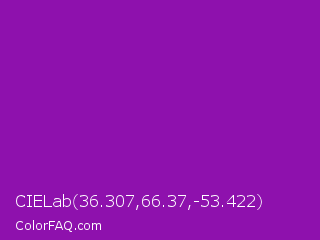 CIELab 36.307,66.37,-53.422 Color is a normal purple color and the nearest color is Violet RYB #8601af. Hex code #8e11ad and RGB value is rgb(142,17,173). In RGB color space, this color is composed of 56% red, 7% green, 68% blue, In CMYK color space, this color is composed of 18% cyan, 90% magenta, 0% yellow , 32% black , In HSL color space, this color has a hue angle of 288° , 82% saturation and 37% lightness.