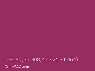 CIELab 36.308,47.921,-4.464 Color is a normal rose color and the nearest color is Amaranth Deep Purple #9f2b68. Hex code #962d5e and RGB value is rgb(150,45,94). In RGB color space, this color is composed of 59% red, 18% green, 37% blue, In CMYK color space, this color is composed of 0% cyan, 70% magenta, 37% yellow , 41% black , In HSL color space, this color has a hue angle of 332° , 54% saturation and 38% lightness.