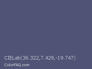 CIELab 36.322,7.429,-19.747 Color is a normal blue color and the nearest color is Independence #4c516d. Hex code #505375 and RGB value is rgb(80,83,117). In RGB color space, this color is composed of 31% red, 33% green, 46% blue, In CMYK color space, this color is composed of 32% cyan, 29% magenta, 0% yellow , 54% black , In HSL color space, this color has a hue angle of 235° , 19% saturation and 39% lightness.