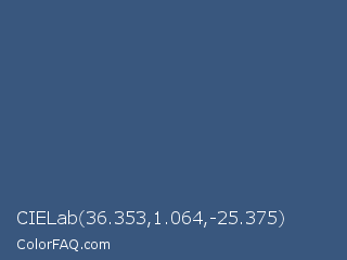 CIELab 36.353,1.064,-25.375 Color is a normal blue color and the nearest color is East Bay #414c7d. Hex code #39577e and RGB value is rgb(57,87,126). In RGB color space, this color is composed of 22% red, 34% green, 49% blue, In CMYK color space, this color is composed of 55% cyan, 31% magenta, 0% yellow , 51% black , In HSL color space, this color has a hue angle of 214° , 38% saturation and 36% lightness.