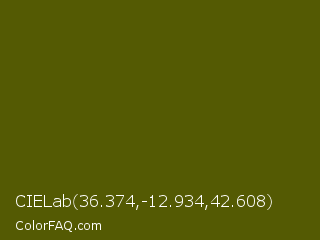 CIELab 36.374,-12.934,42.608 Color is a very dark yellow color and the nearest color is Verdun Green #495400. Hex code #545a03 and RGB value is rgb(84,90,3). In RGB color space, this color is composed of 33% red, 35% green, 1% blue, In CMYK color space, this color is composed of 7% cyan, 0% magenta, 97% yellow , 65% black , In HSL color space, this color has a hue angle of 64° , 94% saturation and 18% lightness.