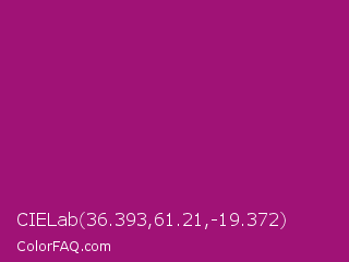 CIELab 36.393,61.21,-19.372 Color is a normal magenta color and the nearest color is Flirt #a2006d. Hex code #a01276 and RGB value is rgb(160,18,118). In RGB color space, this color is composed of 63% red, 7% green, 46% blue, In CMYK color space, this color is composed of 0% cyan, 89% magenta, 26% yellow , 37% black , In HSL color space, this color has a hue angle of 318° , 80% saturation and 35% lightness.