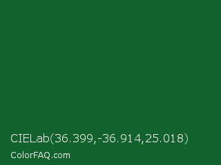 CIELab 36.399,-36.914,25.018 Color is a dark green color and the nearest color is Jewel #126b40. Hex code #11632b and RGB value is rgb(17,99,43). In RGB color space, this color is composed of 7% red, 39% green, 17% blue, In CMYK color space, this color is composed of 83% cyan, 0% magenta, 57% yellow , 61% black , In HSL color space, this color has a hue angle of 139° , 71% saturation and 23% lightness.