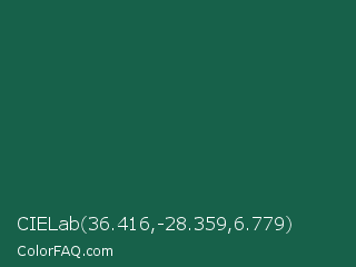 CIELab 36.416,-28.359,6.779 Color is a dark green color and the nearest color is Green Pea #1d6142. Hex code #17614a and RGB value is rgb(23,97,74). In RGB color space, this color is composed of 9% red, 38% green, 29% blue, In CMYK color space, this color is composed of 76% cyan, 0% magenta, 24% yellow , 62% black , In HSL color space, this color has a hue angle of 161° , 62% saturation and 24% lightness.