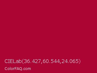 CIELab 36.427,60.544,24.065 Color is a normal rose color and the nearest color is Shiraz #b20931. Hex code #ad0533 and RGB value is rgb(173,5,51). In RGB color space, this color is composed of 68% red, 2% green, 20% blue, In CMYK color space, this color is composed of 0% cyan, 97% magenta, 71% yellow , 32% black , In HSL color space, this color has a hue angle of 344° , 94% saturation and 35% lightness.