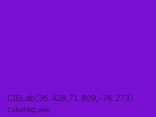 CIELab 36.428,71.809,-76.273 Color is a normal purple color and the nearest color is French Violet #8806ce. Hex code #7a0fd4 and RGB value is rgb(122,15,212). In RGB color space, this color is composed of 48% red, 6% green, 83% blue, In CMYK color space, this color is composed of 42% cyan, 93% magenta, 0% yellow , 17% black , In HSL color space, this color has a hue angle of 273° , 87% saturation and 45% lightness.