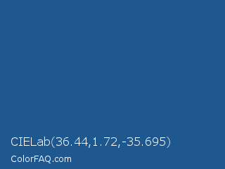 CIELab 36.44,1.72,-35.695 Color is a normal blue color and the nearest color is Cyan Cobalt Blue #28589c. Hex code #1e588f and RGB value is rgb(30,88,143). In RGB color space, this color is composed of 12% red, 35% green, 56% blue, In CMYK color space, this color is composed of 79% cyan, 38% magenta, 0% yellow , 44% black , In HSL color space, this color has a hue angle of 209° , 65% saturation and 34% lightness.