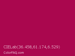 CIELab 36.458,61.174,6.529 Color is a normal rose color and the nearest color is Jazzberry Jam #a50b5e. Hex code #aa074e and RGB value is rgb(170,7,78). In RGB color space, this color is composed of 67% red, 3% green, 31% blue, In CMYK color space, this color is composed of 0% cyan, 96% magenta, 54% yellow , 33% black , In HSL color space, this color has a hue angle of 334° , 92% saturation and 35% lightness.
