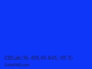 CIELab 36.459,60.845,-95.3 Color is a normal blue color and the nearest color is Blue RYB #0247fe. Hex code #1035f5 and RGB value is rgb(16,53,245). In RGB color space, this color is composed of 6% red, 21% green, 96% blue, In CMYK color space, this color is composed of 93% cyan, 78% magenta, 0% yellow , 4% black , In HSL color space, this color has a hue angle of 230° , 92% saturation and 51% lightness.