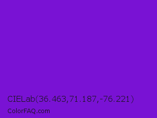 CIELab 36.463,71.187,-76.221 Color is a normal purple color and the nearest color is French Violet #8806ce. Hex code #7912d4 and RGB value is rgb(121,18,212). In RGB color space, this color is composed of 47% red, 7% green, 83% blue, In CMYK color space, this color is composed of 43% cyan, 92% magenta, 0% yellow , 17% black , In HSL color space, this color has a hue angle of 272° , 84% saturation and 45% lightness.