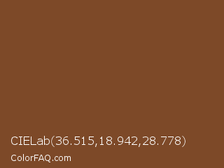 CIELab 36.515,18.942,28.778 Color is a normal orange color and the nearest color is Nutmeg #81422c. Hex code #7d4928 and RGB value is rgb(125,73,40). In RGB color space, this color is composed of 49% red, 29% green, 16% blue, In CMYK color space, this color is composed of 0% cyan, 42% magenta, 68% yellow , 51% black , In HSL color space, this color has a hue angle of 23° , 52% saturation and 32% lightness.