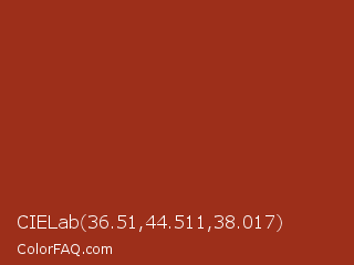 CIELab 36.51,44.511,38.017 Color is a normal red color and the nearest color is Cognac #9f381d. Hex code #9d2f1a and RGB value is rgb(157,47,26). In RGB color space, this color is composed of 62% red, 18% green, 10% blue, In CMYK color space, this color is composed of 0% cyan, 70% magenta, 83% yellow , 38% black , In HSL color space, this color has a hue angle of 10° , 72% saturation and 36% lightness.