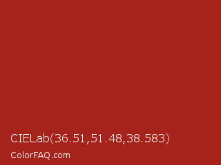 CIELab 36.51,51.48,38.583 Color is a normal red color and the nearest color is Tabasco #a02712. Hex code #a5231a and RGB value is rgb(165,35,26). In RGB color space, this color is composed of 65% red, 14% green, 10% blue, In CMYK color space, this color is composed of 0% cyan, 79% magenta, 84% yellow , 35% black , In HSL color space, this color has a hue angle of 4° , 73% saturation and 37% lightness.