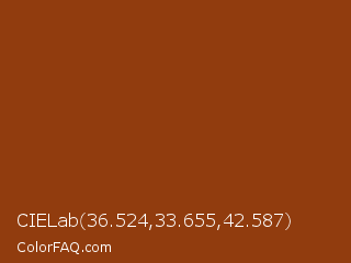 CIELab 36.524,33.655,42.587 Color is a normal orange color and the nearest color is Saddle Brown #8b4513. Hex code #913c0e and RGB value is rgb(145,60,14). In RGB color space, this color is composed of 57% red, 24% green, 5% blue, In CMYK color space, this color is composed of 0% cyan, 59% magenta, 90% yellow , 43% black , In HSL color space, this color has a hue angle of 21° , 82% saturation and 31% lightness.
