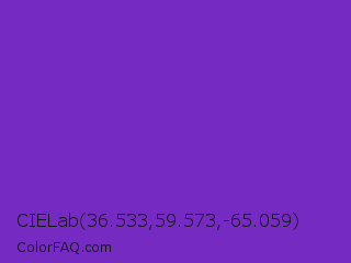 CIELab 36.533,59.573,-65.059 Color is a normal violet color and the nearest color is Purple Heart Crayola #652dc1. Hex code #752ac1 and RGB value is rgb(117,42,193). In RGB color space, this color is composed of 46% red, 16% green, 76% blue, In CMYK color space, this color is composed of 39% cyan, 78% magenta, 0% yellow , 24% black , In HSL color space, this color has a hue angle of 270° , 64% saturation and 46% lightness.