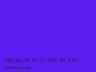 CIELab 36.53,72.498,-91.676 Color is a normal indigo color and the nearest color is Han Purple #5218fa. Hex code #5b1cef and RGB value is rgb(91,28,239). In RGB color space, this color is composed of 36% red, 11% green, 94% blue, In CMYK color space, this color is composed of 62% cyan, 88% magenta, 0% yellow , 6% black , In HSL color space, this color has a hue angle of 258° , 87% saturation and 52% lightness.