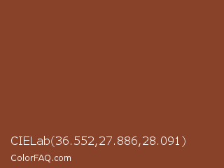 CIELab 36.552,27.886,28.091 Color is a normal color and the nearest color is Nutmeg #81422c. Hex code #88422a and RGB value is rgb(136,66,42). In RGB color space, this color is composed of 53% red, 26% green, 16% blue, In CMYK color space, this color is composed of 0% cyan, 51% magenta, 69% yellow , 47% black , In HSL color space, this color has a hue angle of 15° , 53% saturation and 35% lightness.