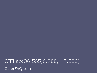 CIELab 36.565,6.288,-17.506 Color is a normal blue color and the nearest color is Independence #4c516d. Hex code #515472 and RGB value is rgb(81,84,114). In RGB color space, this color is composed of 32% red, 33% green, 45% blue, In CMYK color space, this color is composed of 29% cyan, 26% magenta, 0% yellow , 55% black , In HSL color space, this color has a hue angle of 235° , 17% saturation and 38% lightness.