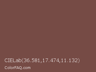 CIELab 36.581,17.474,11.132 Color is a normal red color and the nearest color is Tuscan Red #7c4848. Hex code #764b45 and RGB value is rgb(118,75,69). In RGB color space, this color is composed of 46% red, 29% green, 27% blue, In CMYK color space, this color is composed of 0% cyan, 36% magenta, 42% yellow , 54% black , In HSL color space, this color has a hue angle of 7° , 26% saturation and 37% lightness.