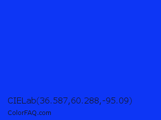 CIELab 36.587,60.288,-95.09 Color is a normal blue color and the nearest color is Blue RYB #0247fe. Hex code #0d36f5 and RGB value is rgb(13,54,245). In RGB color space, this color is composed of 5% red, 21% green, 96% blue, In CMYK color space, this color is composed of 95% cyan, 78% magenta, 0% yellow , 4% black , In HSL color space, this color has a hue angle of 229° , 92% saturation and 51% lightness.