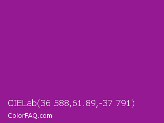 CIELab 36.588,61.89,-37.791 Color is a normal magenta color and the nearest color is Violet Eggplant #991199. Hex code #961994 and RGB value is rgb(150,25,148). In RGB color space, this color is composed of 59% red, 10% green, 58% blue, In CMYK color space, this color is composed of 0% cyan, 83% magenta, 1% yellow , 41% black , In HSL color space, this color has a hue angle of 301° , 71% saturation and 34% lightness.