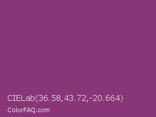 CIELab 36.58,43.72,-20.664 Color is a normal magenta color and the nearest color is Razzmic Berry Crayola #843179. Hex code #893678 and RGB value is rgb(137,54,120). In RGB color space, this color is composed of 54% red, 21% green, 47% blue, In CMYK color space, this color is composed of 0% cyan, 61% magenta, 12% yellow , 46% black , In HSL color space, this color has a hue angle of 312° , 43% saturation and 37% lightness.