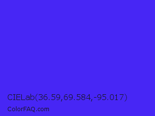 CIELab 36.59,69.584,-95.017 Color is a normal indigo color and the nearest color is Han Purple #5218fa. Hex code #4726f5 and RGB value is rgb(71,38,245). In RGB color space, this color is composed of 28% red, 15% green, 96% blue, In CMYK color space, this color is composed of 71% cyan, 84% magenta, 0% yellow , 4% black , In HSL color space, this color has a hue angle of 250° , 91% saturation and 55% lightness.