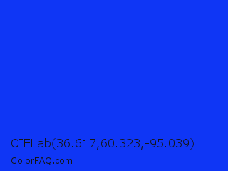 CIELab 36.617,60.323,-95.039 Color is a normal blue color and the nearest color is Blue RYB #0247fe. Hex code #0f36f5 and RGB value is rgb(15,54,245). In RGB color space, this color is composed of 6% red, 21% green, 96% blue, In CMYK color space, this color is composed of 94% cyan, 78% magenta, 0% yellow , 4% black , In HSL color space, this color has a hue angle of 230° , 92% saturation and 51% lightness.