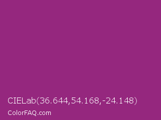 CIELab 36.644,54.168,-24.148 Color is a normal magenta color and the nearest color is Razzmic Berry Crayola #843179. Hex code #95277e and RGB value is rgb(149,39,126). In RGB color space, this color is composed of 58% red, 15% green, 49% blue, In CMYK color space, this color is composed of 0% cyan, 74% magenta, 15% yellow , 42% black , In HSL color space, this color has a hue angle of 313° , 59% saturation and 37% lightness.