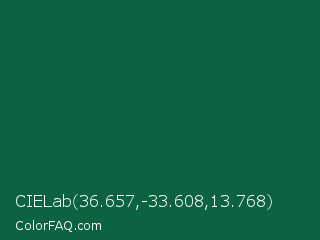 CIELab 36.657,-33.608,13.768 Color is a very dark green color and the nearest color is Jewel #126b40. Hex code #0b633f and RGB value is rgb(11,99,63). In RGB color space, this color is composed of 4% red, 39% green, 25% blue, In CMYK color space, this color is composed of 89% cyan, 0% magenta, 36% yellow , 61% black , In HSL color space, this color has a hue angle of 155° , 80% saturation and 22% lightness.