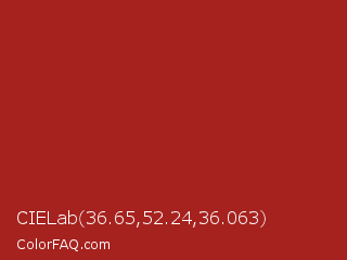 CIELab 36.65,52.24,36.063 Color is a normal red color and the nearest color is Mexican Red #a72525. Hex code #a6221f and RGB value is rgb(166,34,31). In RGB color space, this color is composed of 65% red, 13% green, 12% blue, In CMYK color space, this color is composed of 0% cyan, 80% magenta, 81% yellow , 35% black , In HSL color space, this color has a hue angle of 1° , 69% saturation and 39% lightness.