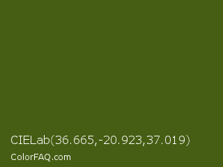 CIELab 36.665,-20.923,37.019 Color is a very dark lime color and the nearest color is Green Leaf #436a0d. Hex code #465e14 and RGB value is rgb(70,94,20). In RGB color space, this color is composed of 27% red, 37% green, 8% blue, In CMYK color space, this color is composed of 26% cyan, 0% magenta, 79% yellow , 63% black , In HSL color space, this color has a hue angle of 79° , 65% saturation and 22% lightness.
