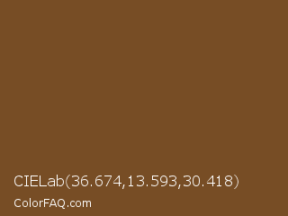 CIELab 36.674,13.593,30.418 Color is a normal orange color and the nearest color is Dallas #6e4b26. Hex code #774d25 and RGB value is rgb(119,77,37). In RGB color space, this color is composed of 47% red, 30% green, 15% blue, In CMYK color space, this color is composed of 0% cyan, 35% magenta, 69% yellow , 53% black , In HSL color space, this color has a hue angle of 29° , 53% saturation and 31% lightness.