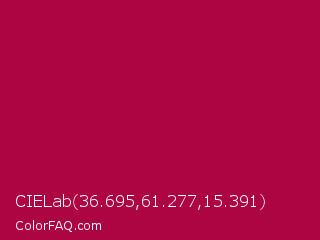 CIELab 36.695,61.277,15.391 Color is a normal rose color and the nearest color is Shiraz #b20931. Hex code #ad0541 and RGB value is rgb(173,5,65). In RGB color space, this color is composed of 68% red, 2% green, 25% blue, In CMYK color space, this color is composed of 0% cyan, 97% magenta, 62% yellow , 32% black , In HSL color space, this color has a hue angle of 339° , 94% saturation and 35% lightness.