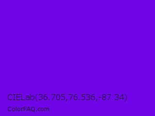 CIELab 36.705,76.536,-87.34 Color is a normal violet color and the nearest color is Electric Indigo #6f00ff. Hex code #7005e8 and RGB value is rgb(112,5,232). In RGB color space, this color is composed of 44% red, 2% green, 91% blue, In CMYK color space, this color is composed of 52% cyan, 98% magenta, 0% yellow , 9% black , In HSL color space, this color has a hue angle of 268° , 96% saturation and 46% lightness.