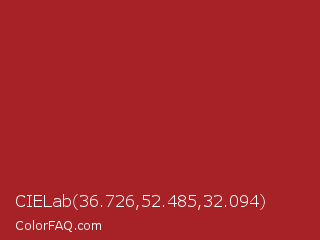 CIELab 36.726,52.485,32.094 Color is a normal red color and the nearest color is Mexican Red #a72525. Hex code #a62226 and RGB value is rgb(166,34,38). In RGB color space, this color is composed of 65% red, 13% green, 15% blue, In CMYK color space, this color is composed of 0% cyan, 80% magenta, 77% yellow , 35% black , In HSL color space, this color has a hue angle of 358° , 66% saturation and 39% lightness.