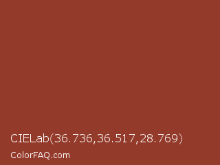 CIELab 36.736,36.517,28.769 Color is a normal red color and the nearest color is El Salva #8f3e33. Hex code #933a2a and RGB value is rgb(147,58,42). In RGB color space, this color is composed of 58% red, 23% green, 16% blue, In CMYK color space, this color is composed of 0% cyan, 61% magenta, 71% yellow , 42% black , In HSL color space, this color has a hue angle of 9° , 56% saturation and 37% lightness.
