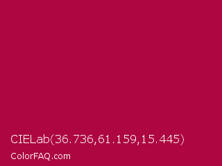 CIELab 36.736,61.159,15.445 Color is a normal rose color and the nearest color is Shiraz #b20931. Hex code #ad0641 and RGB value is rgb(173,6,65). In RGB color space, this color is composed of 68% red, 2% green, 25% blue, In CMYK color space, this color is composed of 0% cyan, 97% magenta, 62% yellow , 32% black , In HSL color space, this color has a hue angle of 339° , 93% saturation and 35% lightness.