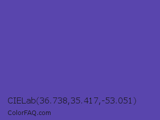 CIELab 36.738,35.417,-53.051 Color is a normal indigo color and the nearest color is Plump Purple #5946b2. Hex code #5945ad and RGB value is rgb(89,69,173). In RGB color space, this color is composed of 35% red, 27% green, 68% blue, In CMYK color space, this color is composed of 49% cyan, 60% magenta, 0% yellow , 32% black , In HSL color space, this color has a hue angle of 252° , 43% saturation and 47% lightness.