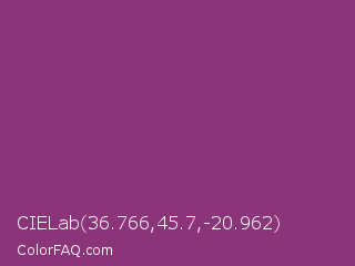CIELab 36.766,45.7,-20.962 Color is a normal magenta color and the nearest color is Razzmic Berry Crayola #843179. Hex code #8c3479 and RGB value is rgb(140,52,121). In RGB color space, this color is composed of 55% red, 20% green, 47% blue, In CMYK color space, this color is composed of 0% cyan, 63% magenta, 14% yellow , 45% black , In HSL color space, this color has a hue angle of 313° , 46% saturation and 38% lightness.