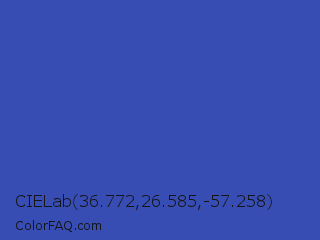 CIELab 36.772,26.585,-57.258 Color is a normal blue color and the nearest color is Violet Blue #324ab2. Hex code #374db4 and RGB value is rgb(55,77,180). In RGB color space, this color is composed of 22% red, 30% green, 71% blue, In CMYK color space, this color is composed of 69% cyan, 57% magenta, 0% yellow , 29% black , In HSL color space, this color has a hue angle of 229° , 53% saturation and 46% lightness.
