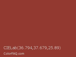 CIELab 36.794,37.679,25.89 Color is a normal red color and the nearest color is El Salva #8f3e33. Hex code #94392f and RGB value is rgb(148,57,47). In RGB color space, this color is composed of 58% red, 22% green, 18% blue, In CMYK color space, this color is composed of 0% cyan, 61% magenta, 68% yellow , 42% black , In HSL color space, this color has a hue angle of 6° , 52% saturation and 38% lightness.