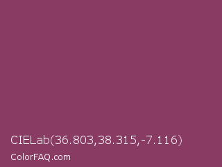 CIELab 36.803,38.315,-7.116 Color is a normal rose color and the nearest color is Cannon Pink #894367. Hex code #8a3b63 and RGB value is rgb(138,59,99). In RGB color space, this color is composed of 54% red, 23% green, 39% blue, In CMYK color space, this color is composed of 0% cyan, 57% magenta, 28% yellow , 46% black , In HSL color space, this color has a hue angle of 330° , 40% saturation and 39% lightness.
