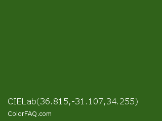 CIELab 36.815,-31.107,34.255 Color is a dark green color and the nearest color is Dell #396413. Hex code #30621a and RGB value is rgb(48,98,26). In RGB color space, this color is composed of 19% red, 38% green, 10% blue, In CMYK color space, this color is composed of 51% cyan, 0% magenta, 73% yellow , 62% black , In HSL color space, this color has a hue angle of 102° , 58% saturation and 24% lightness.