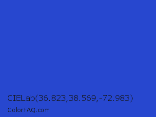 CIELab 36.823,38.569,-72.983 Color is a normal blue color and the nearest color is New Car #214fc6. Hex code #2747cf and RGB value is rgb(39,71,207). In RGB color space, this color is composed of 15% red, 28% green, 81% blue, In CMYK color space, this color is composed of 81% cyan, 66% magenta, 0% yellow , 19% black , In HSL color space, this color has a hue angle of 229° , 68% saturation and 48% lightness.