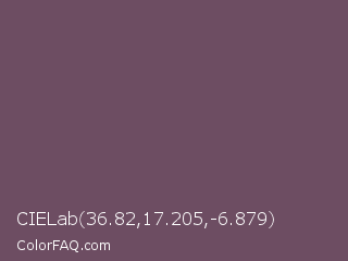 CIELab 36.82,17.205,-6.879 Color is a normal magenta color and the nearest color is Zambezi #685558. Hex code #6d4d62 and RGB value is rgb(109,77,98). In RGB color space, this color is composed of 43% red, 30% green, 38% blue, In CMYK color space, this color is composed of 0% cyan, 29% magenta, 10% yellow , 57% black , In HSL color space, this color has a hue angle of 321° , 17% saturation and 36% lightness.
