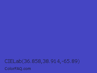 CIELab 36.858,38.914,-65.89 Color is a normal blue color and the nearest color is Ocean Blue #4f42b5. Hex code #4545c3 and RGB value is rgb(69,69,195). In RGB color space, this color is composed of 27% red, 27% green, 76% blue, In CMYK color space, this color is composed of 65% cyan, 65% magenta, 0% yellow , 24% black , In HSL color space, this color has a hue angle of 240° , 51% saturation and 52% lightness.