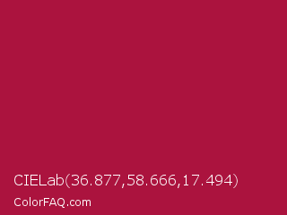 CIELab 36.877,58.666,17.494 Color is a normal rose color and the nearest color is French Wine #ac1e44. Hex code #ab133e and RGB value is rgb(171,19,62). In RGB color space, this color is composed of 67% red, 7% green, 24% blue, In CMYK color space, this color is composed of 0% cyan, 89% magenta, 64% yellow , 33% black , In HSL color space, this color has a hue angle of 343° , 80% saturation and 37% lightness.